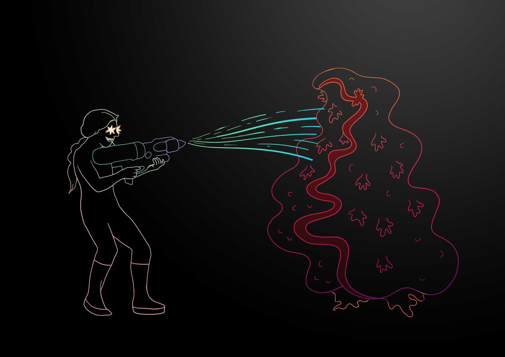 И лечение началось. Мама села в кресло сама, посадила на колени младшую дочь Аню и обняла её руками, как ремень безопасности. Но страх от мамы передался дочери, она сразу начала капризничать и вырываться. Старшая, Настя, из-за маминой сумки, которая тоже сидела у неё на коленях, сурово смотрела, как мама пытается успокоить младшую. Тут Аня отвлеклась и захихикала от щекотки, стоматологиня начала чистить ей зубы, но не щёткой, как дома, а каким-то хитрым механизмом. После чистки стоматологиня стала учить девочку стрелять из пистолетика то водой, то воздухом. Тут-то старшая не усидела. Настя подошла к креслу и требовательно объявила: «Теперь моя очередь!» Мама засмеялась, не стесняясь зубов, и вместе с Аней освободила место. Космический корабль захлопнул турникет и начал поднимать Настю, стреляющую из пистолетика по жалюзи. Молодая докторка успокоила сеющую суету порядка медсестру взглядом. Во время осмотра обнаружилась пара кариесов. Огненный локон докторки выбился из-под шапочки и стал нашёптывать что-то Насте. Пистолетик, стреляющий водой и воздухом, превратился в её руках в водомёт. Мама стала защитной искрящейся сферой вокруг Насти. А прямо перед ней выросли два кариозных монстра. Серо-буро-зелёные, смердящие и разъедающие всё на своём пути. Мощный поток воды свалил их с ног и размножил на множество мелких монстрят. Они стали остервенело кидаться на Настю, которая сбивала и растворяла их водомётом с налёту. Несколько монстриков вцепились в оболочку Насти и тут же, заискрившись, растворились.